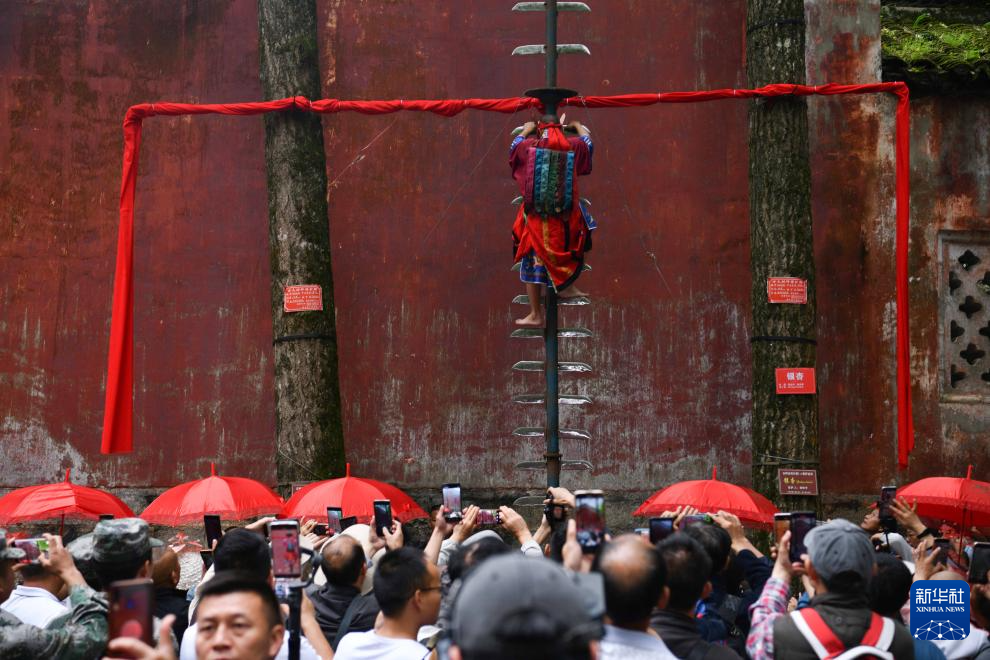 5月15日,民间艺人在贵州省黔东南苗族侗族自治州黄平县飞云崖景区“四月八”活动现场表演“上刀山”。新华社发(李静 摄)pagebreak