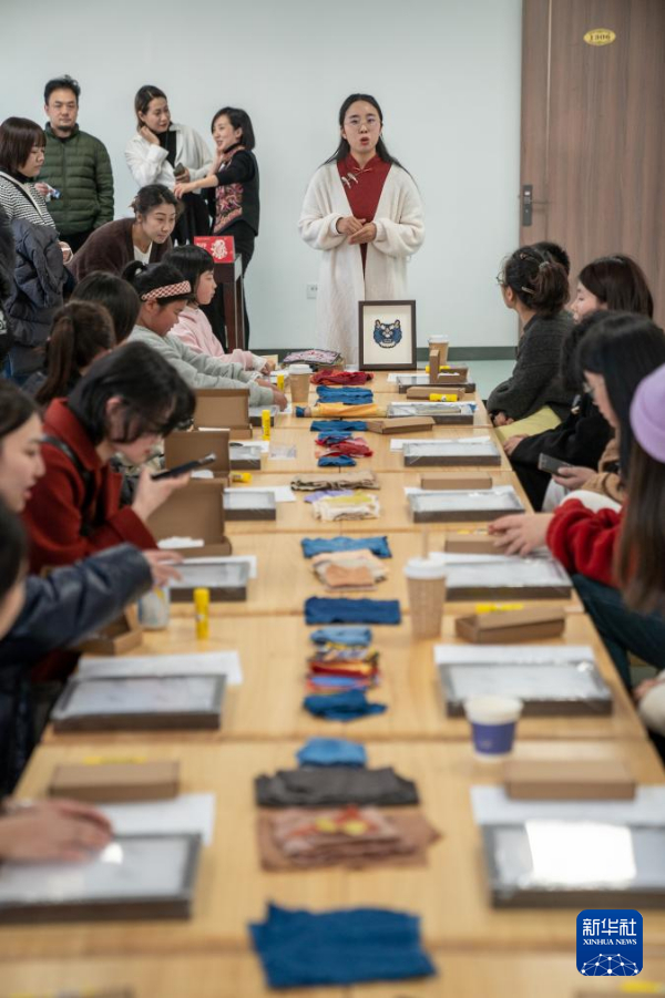 2024年2月5日贵州省民族博物馆举办的龙年生肖展社交活动现场,群众在馆内老师带领下开展拼布、拓印等非遗手工体验活动。新华社发