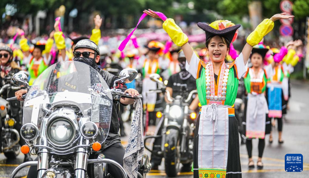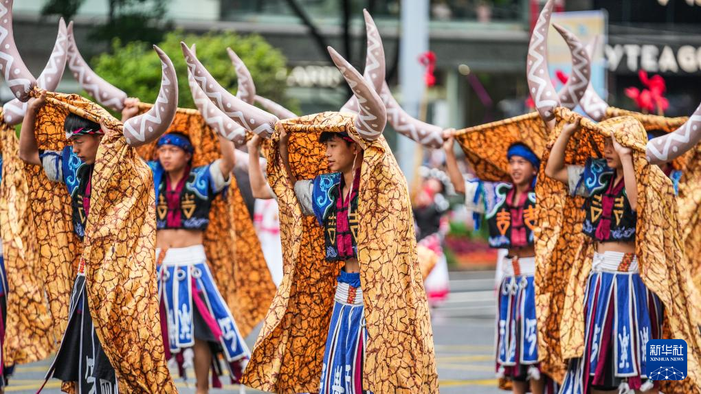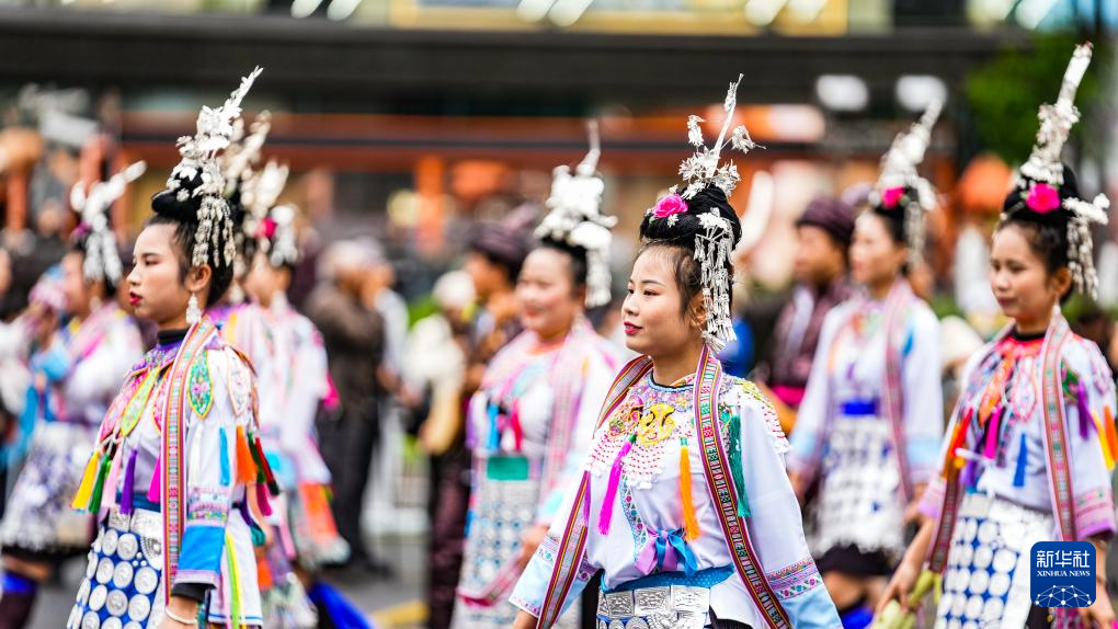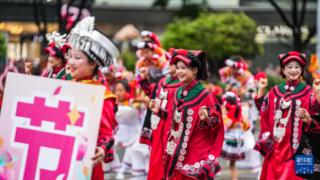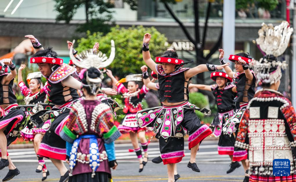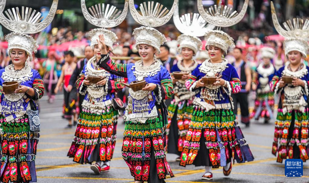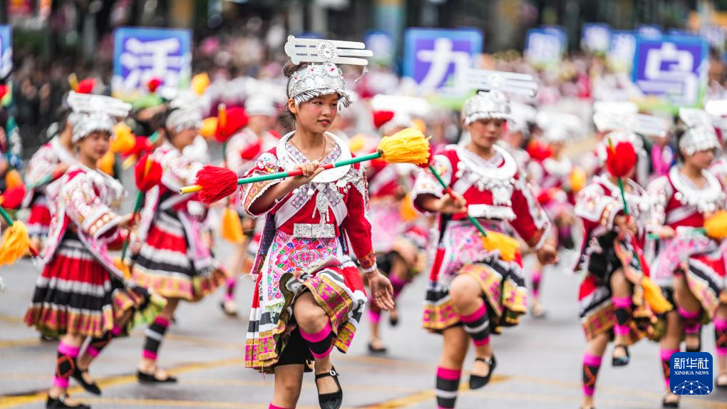 5月18日,黔东南方阵的表演队伍在进行巡游。新华社记者 陶亮 摄