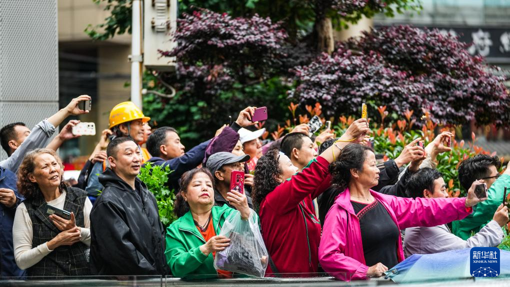 5月18日,市民在贵阳市云岩区中华北路旁观看巡游表演。新华社记者 陶亮 摄