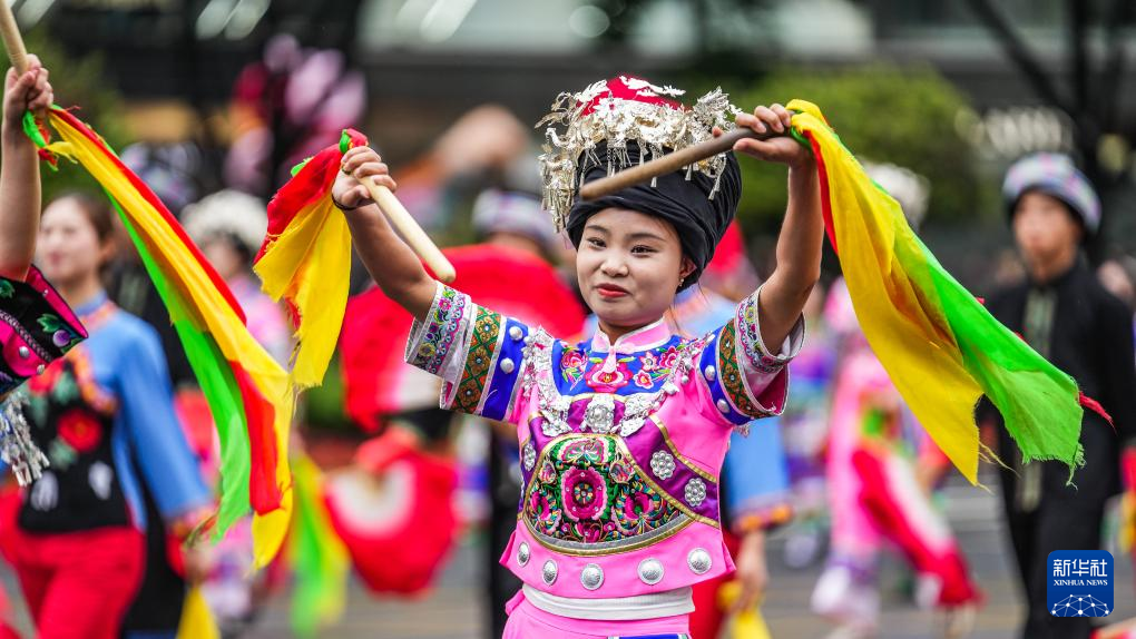5月18日,黔南方阵的表演队伍在进行巡游。新华社记者 陶亮 摄