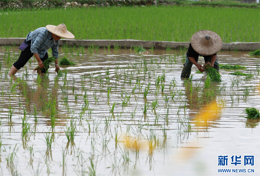 5月20日,在贵州省黔东南苗族侗族自治州榕江县朗洞镇平地村,村民在扯秧、运苗。新华网发(吴化雨 摄)