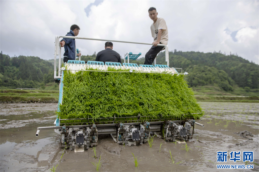 5月20日,在贵州省黔东南苗族侗族自治州从江县往洞镇信地村,农民驾驶插秧机插秧苗。新华网发(吴德军 摄)pagebreak
