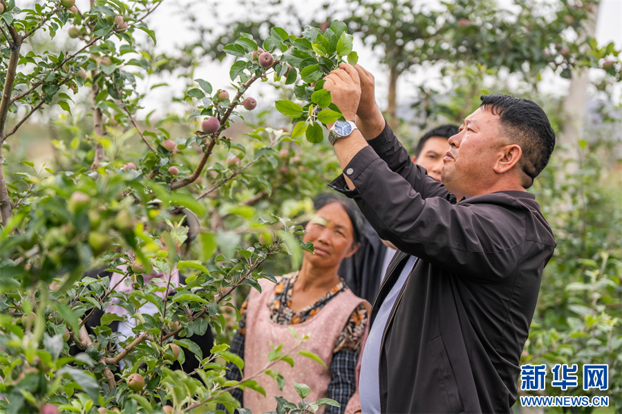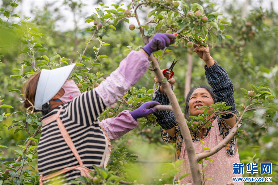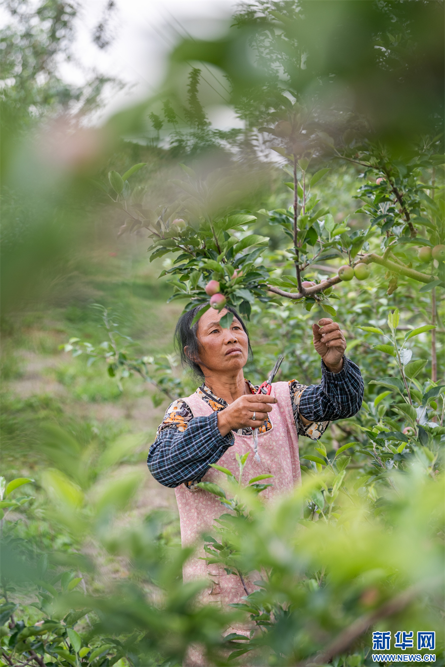 5月20日,贵州省威宁彝族回族苗族自治县中水镇东光社区村民在苹果基地疏果。新华网发(罗大富 摄)