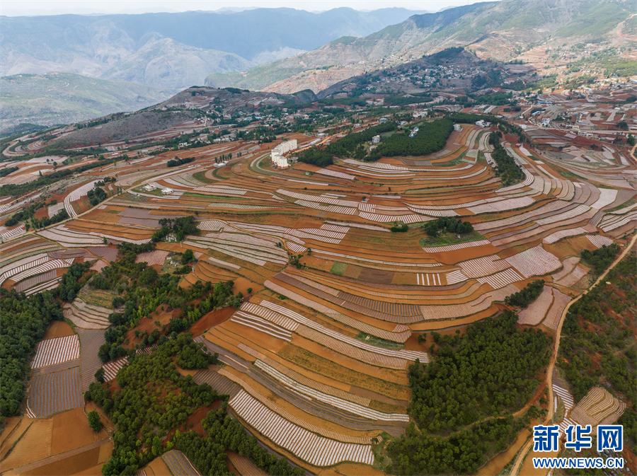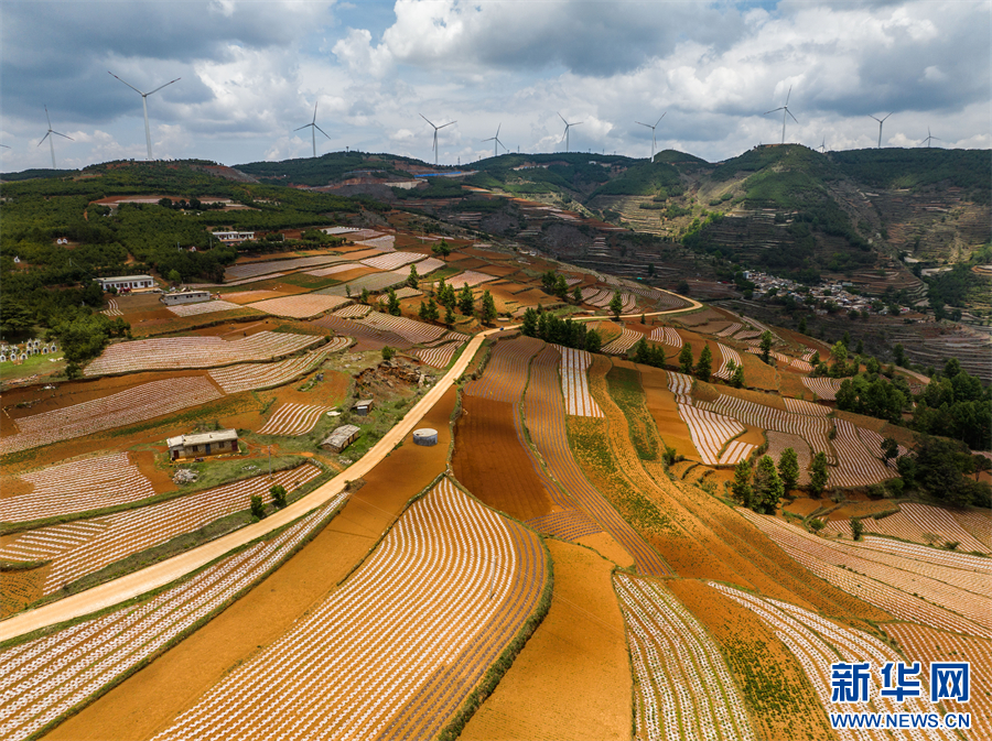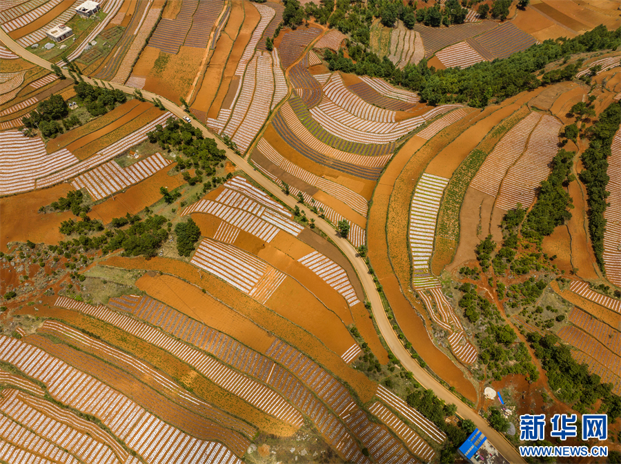 夏日时节,在贵州省毕节市威宁彝族回族苗族自治县海拉镇,随着当地夏种工作陆续开展,高山深谷的缓坡上,色彩斑斓的地块随意拼接,美轮美奂。从空中俯瞰,错落有致的民居、连绵起伏的山峦与蜿蜒的道路相映成景,与绚丽的土地一起,犹如画家手中的“调色盘”。