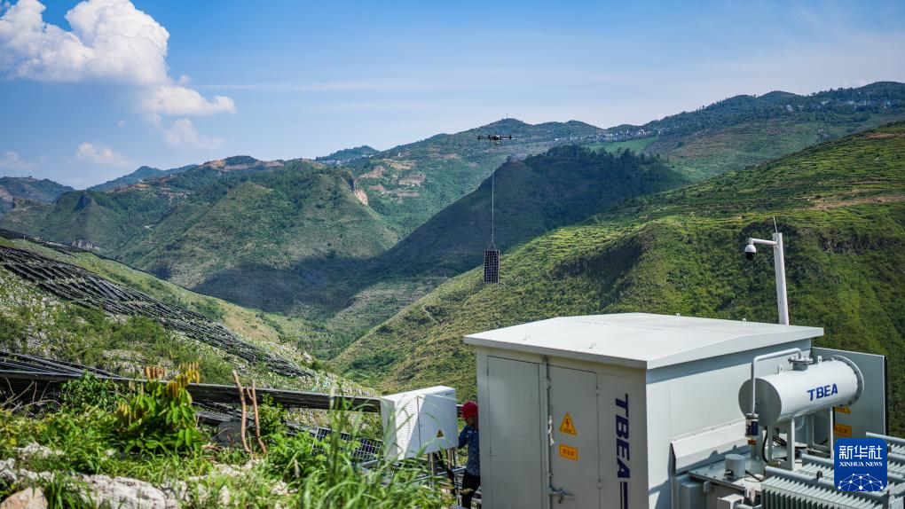 在盘江百万千瓦级光伏基地,无人机在调运光伏板(5月23日摄)。新华社记者 陶亮 摄pagebreak