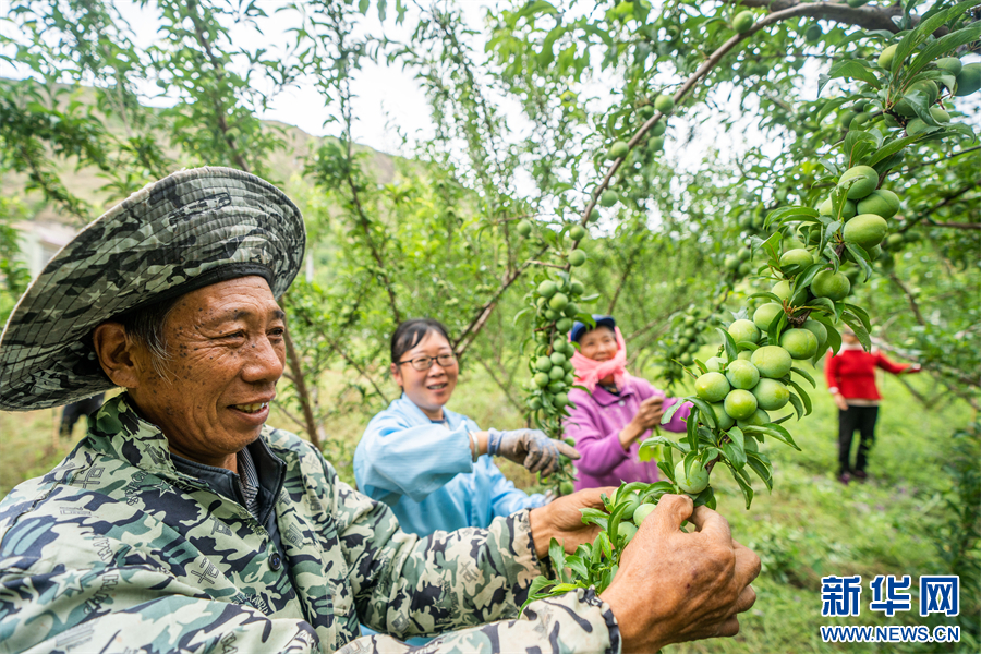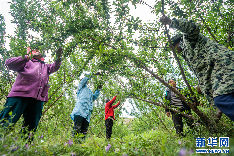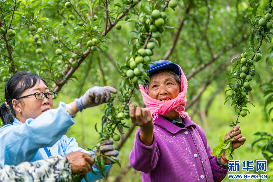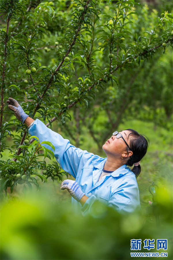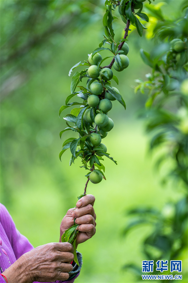 贵州省毕节市威宁彝族回族苗族自治县玉龙镇大寨村村民在为蜂糖李抹芽(5月30日摄)。新华网发(罗大富 摄)pagebreak