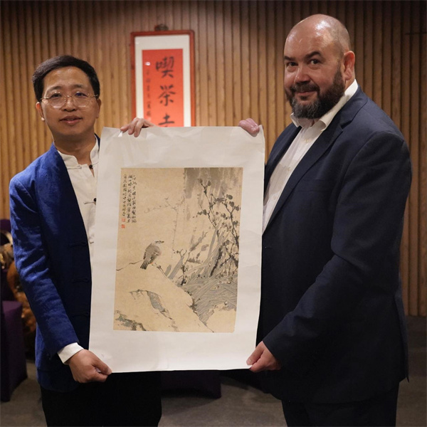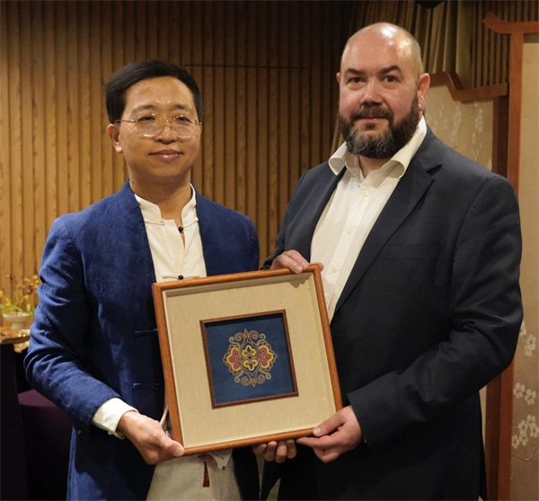 会面期间,山峰把黔南囯家级非遗宋水仙马尾绣和都匀青年画家伍国春的工笔画作为礼物赠送给米卡·瑞琵。