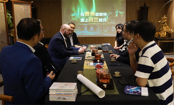 6月5日,长篇小说《从贵州到罗瓦涅米》外文版面世在即,受江西省人民政府邀请来中国访问的芬兰拉普兰省省长米卡·瑞琵一行,返回芬兰之前,与中国作家山峰在上海进行了短暂会面。