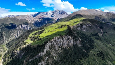 仲夏时节,俯瞰位于贵州省铜仁市的世界自然遗产地梵净山景区,漫山遍野,林木葱茏,绿意盎然,不时云雾缭绕,美如画卷一般。