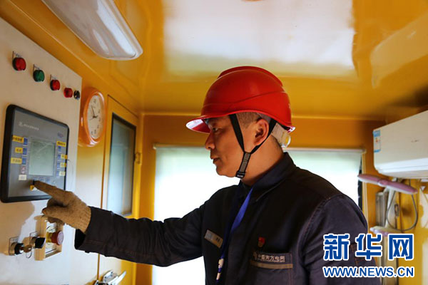 都匀城区分局蔡勇在发电车内操作发电机启动监屏。新华网发