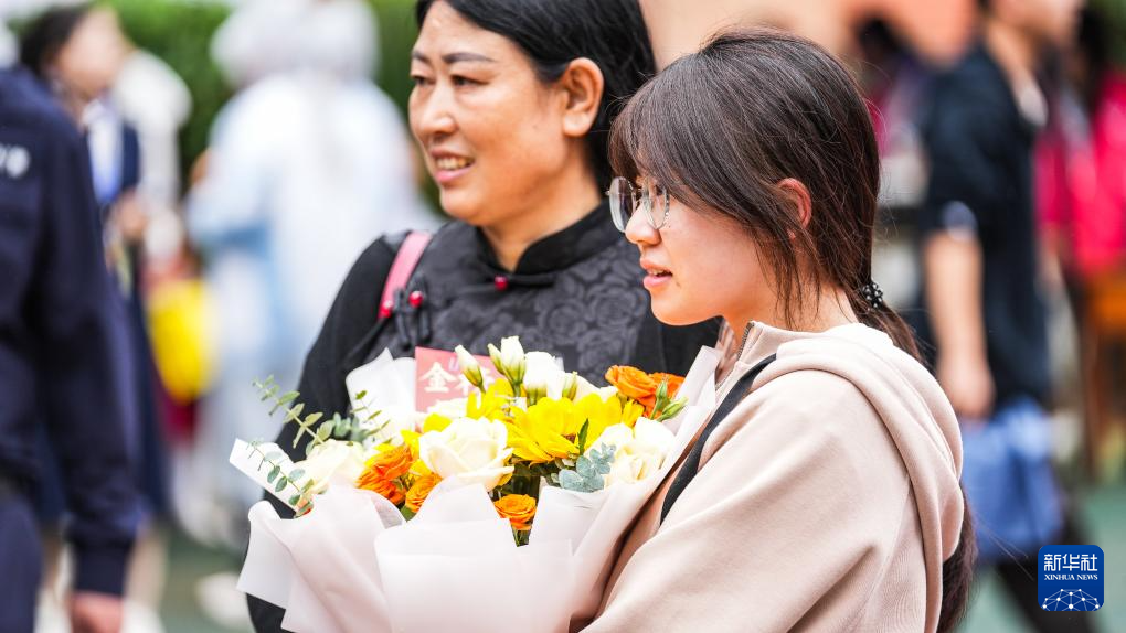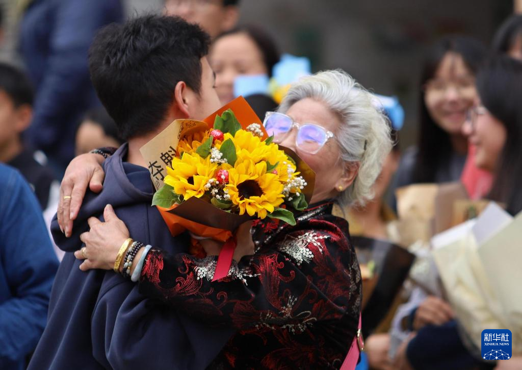 6月9日,在贵州省黔东南苗族侗族自治州丹寨民族高级中学考点,手捧鲜花的考生与家人拥抱。新华社发(陆德华 摄)
