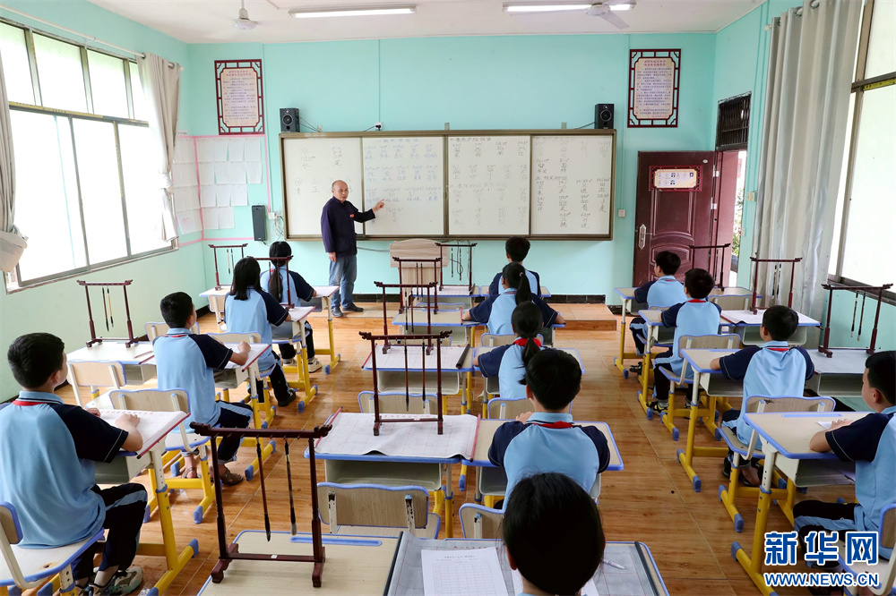 6月11日,在贵州省黔东南苗族侗族自治州榕江县水尾水族乡中心校,一名老师在教学生学唱水族民歌。新华网发(李长华 摄)pagebreak