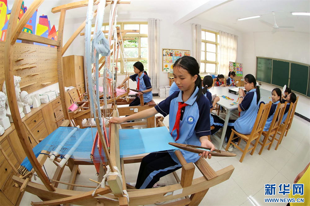 6月11日,在贵州省黔东南苗族侗族自治州榕江县水尾水族乡中心校,学生在学习织布。