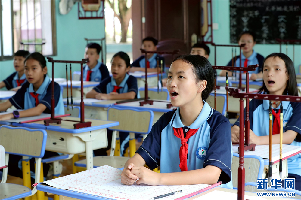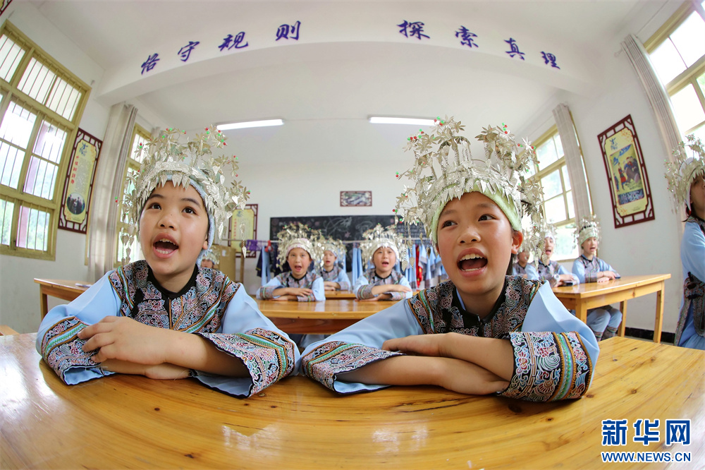 6月11日,在贵州省黔东南苗族侗族自治州榕江县水尾水族乡中心校,学生在学唱水族民歌。新华网发(李长华 摄)pagebreak