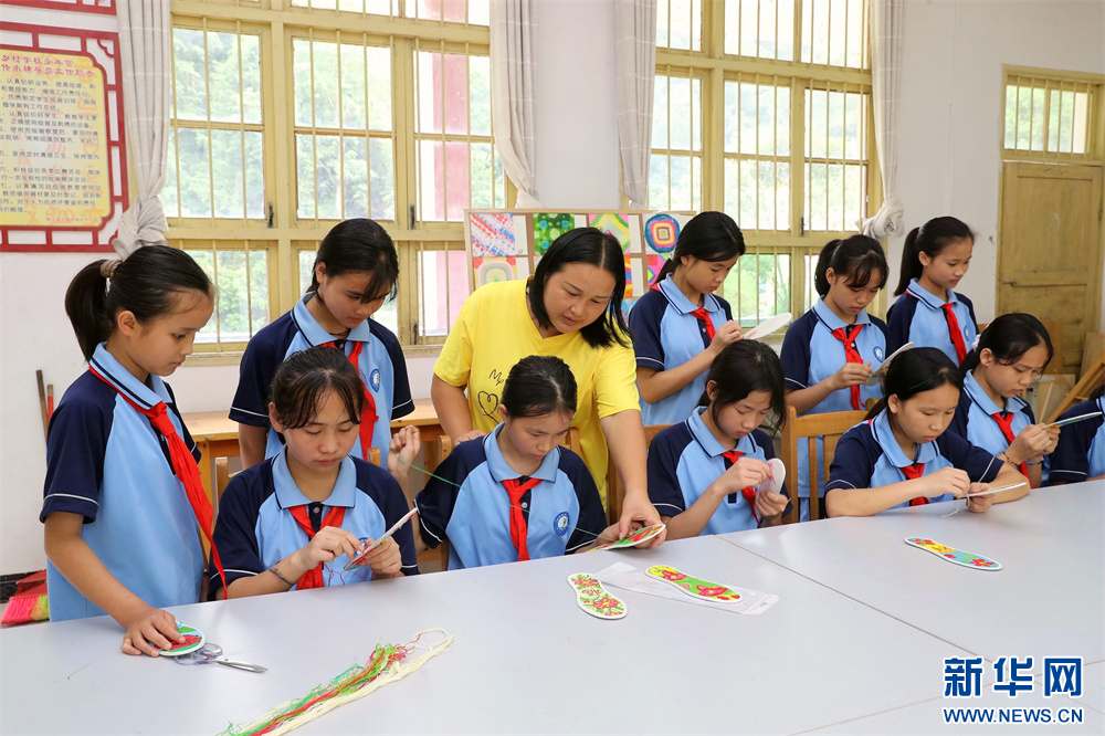 6月11日,在贵州省黔东南苗族侗族自治州榕江县水尾水族乡中心校,一名老师在指导学生学习绣鞋垫。新华网发(李长华 摄)pagebreak