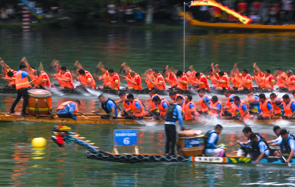 6月10日,在贵州省镇远县㵲阳河,参赛的龙舟队在抵达终点后返程。