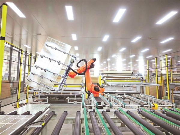 黔玻永太公司车间里,数控机械臂精准抓取、打包光伏玻璃。