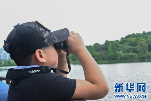 活动现场,广州研学团小朋友使用望远镜观鸟。新华网发(洪应龙 摄)