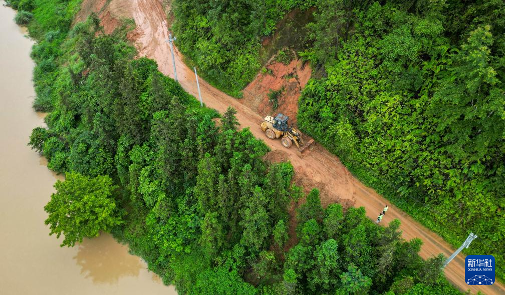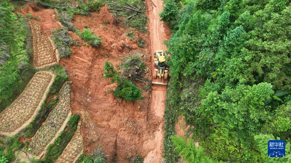 6月18日,工作人员驾驶机械在贵州省黔东南苗族侗族自治州锦屏县钟灵乡清理进村道路(无人机照片)。新华社发(杨晓海摄)