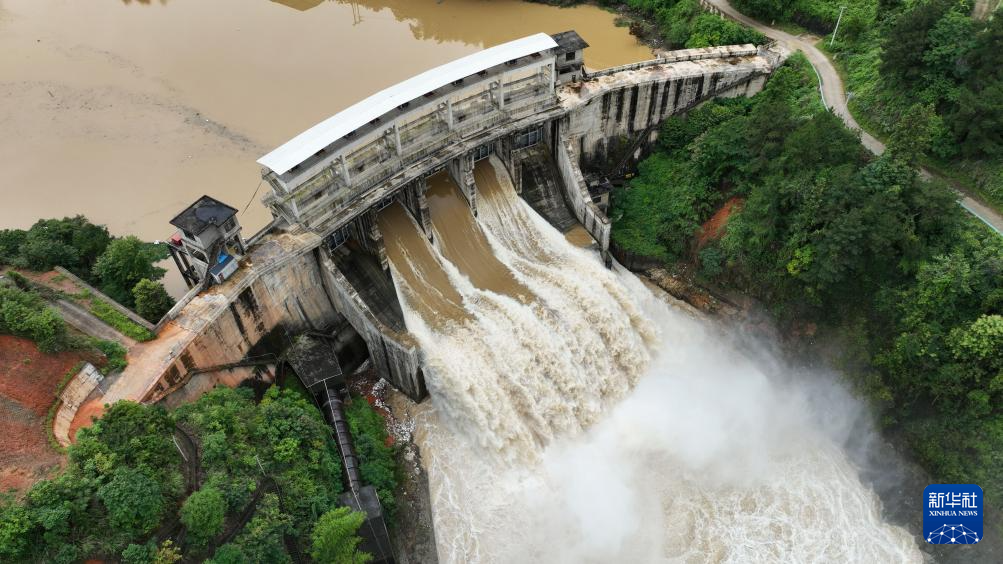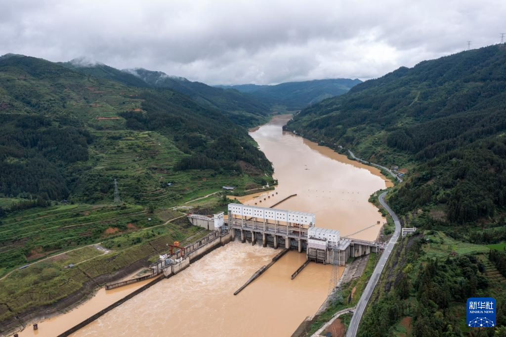 6月18日,位于贵州省黔东南苗族侗族自治州从江县境内的都柳江大融航电枢纽大坝开闸泄洪(无人机照片)。新华社发(吴德军摄)pagebreak