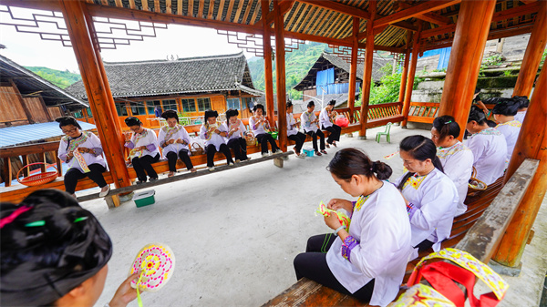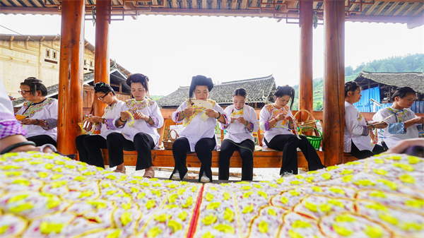 6月20日,在贵州省黔东南苗族侗族自治州榕江县仁里乡仁吉村,侗族妇女在刺绣。
