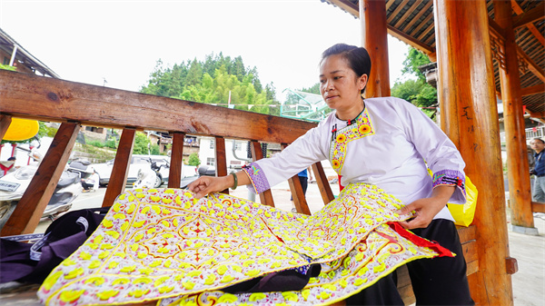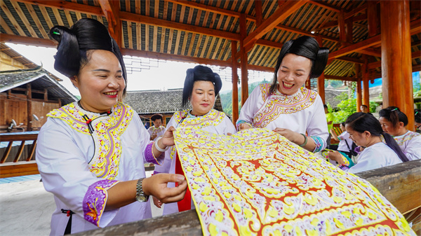 6月20日,在贵州省黔东南苗族侗族自治州榕江县仁里乡仁吉村,侗族妇女在展示刺绣产品。