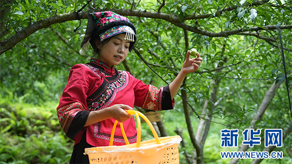 六马镇果农刘文飘在自家果园里采摘蜂糖李。新华网 卢志佳 摄