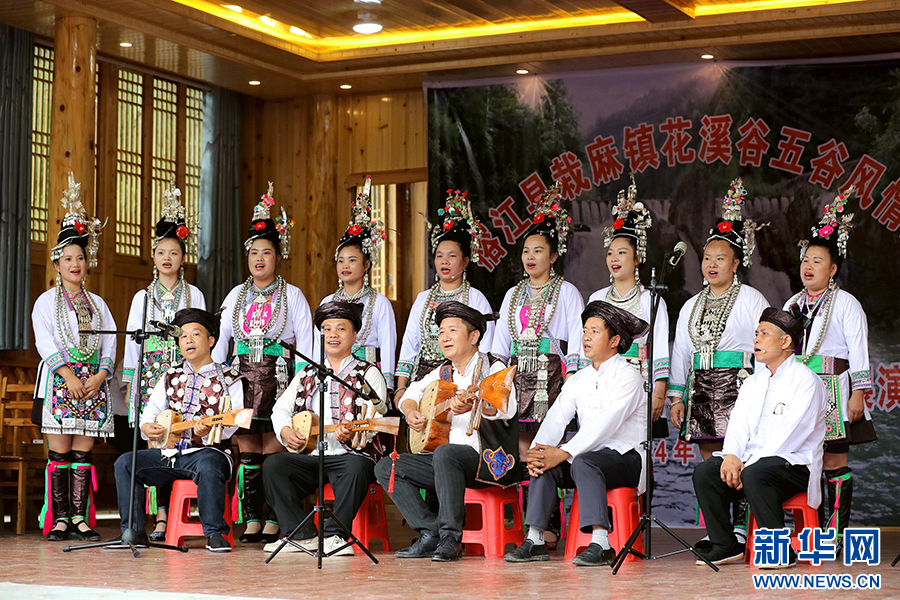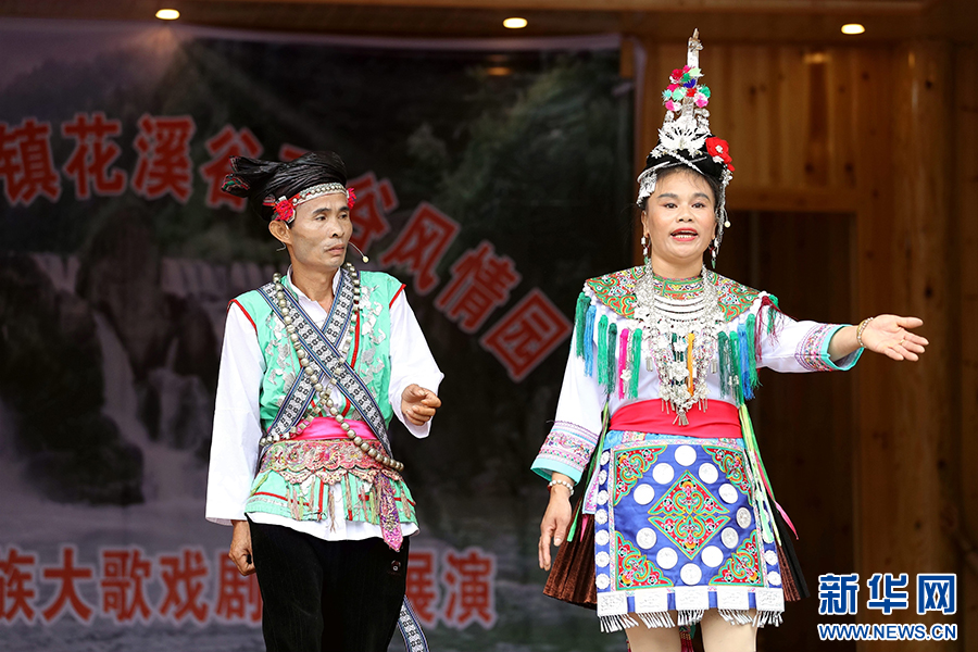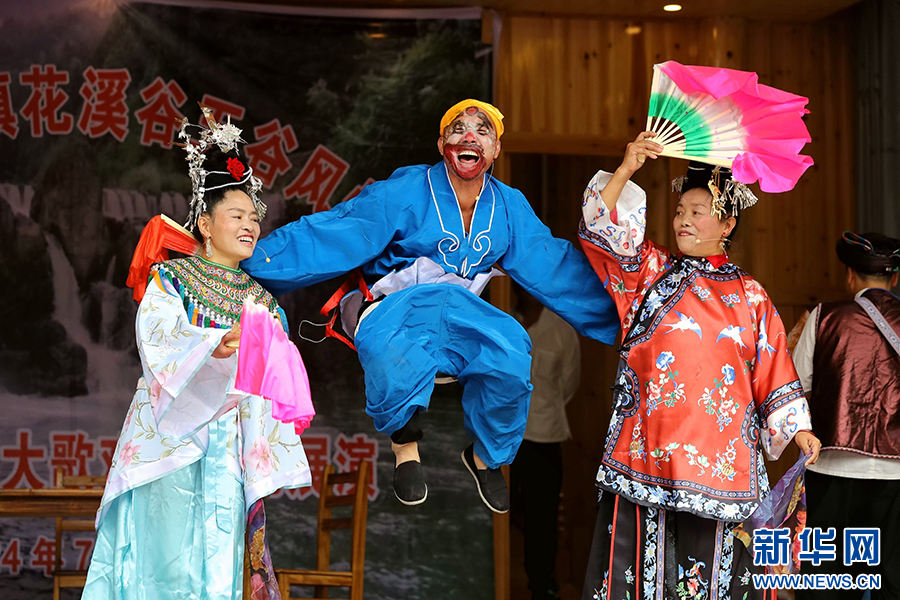 7月3日,在贵州省黔东南苗族侗族自治州榕江县栽麻镇高硐村花溪谷旅游景点,侗族村民在表演侗戏。新华网发(李长华 摄)pagebreak