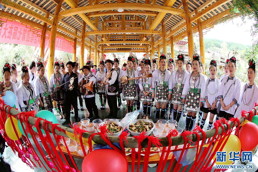 7月3日,在贵州省黔东南苗族侗族自治州榕江县栽麻镇高硐村花溪谷旅游景点,侗族群众在表演拦门酒歌。新华网发(李长华 摄)pagebreak