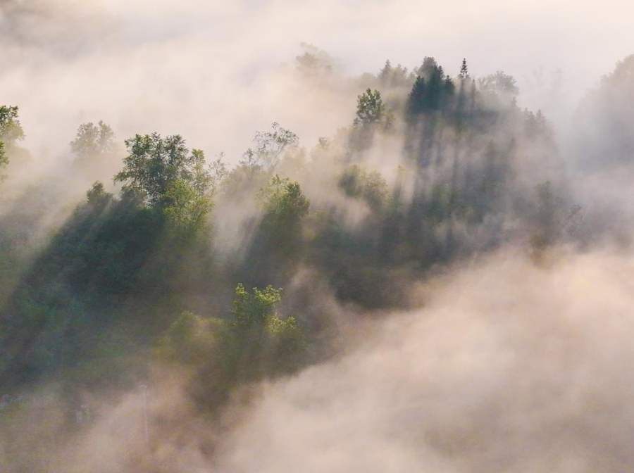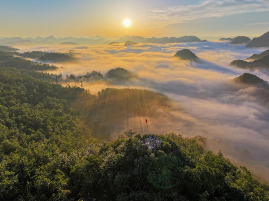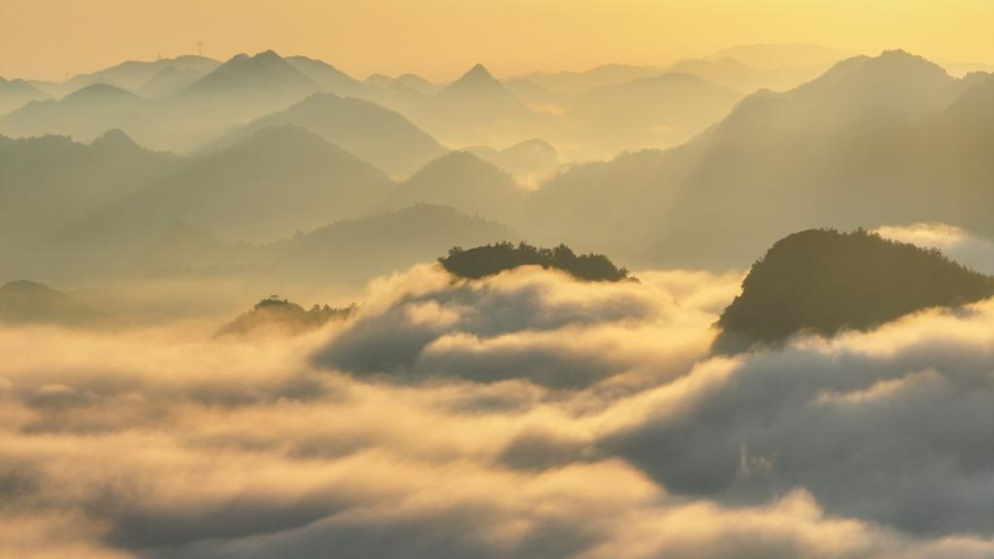 连日来,贵州省毕节市七星关区倒天河水库出现壮美的日出云海景观。清晨,一轮红日冉冉升起,金色的阳光洒落在树林间,晨雾如轻纱环绕,山峦在云海之上若隐若现,仿佛一幅动人的水墨画,美不胜收。