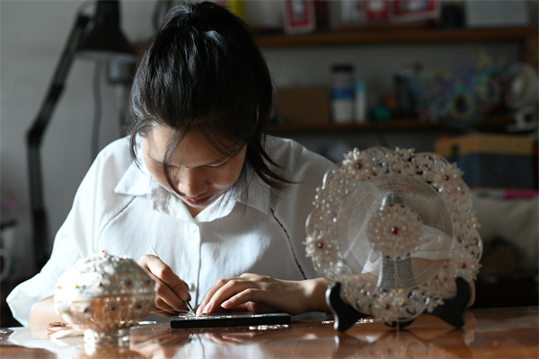 其丈夫穆天来默默比吴秋燕提前交卷,他的作品是“一只双层立体感的花丝蝴蝶”。