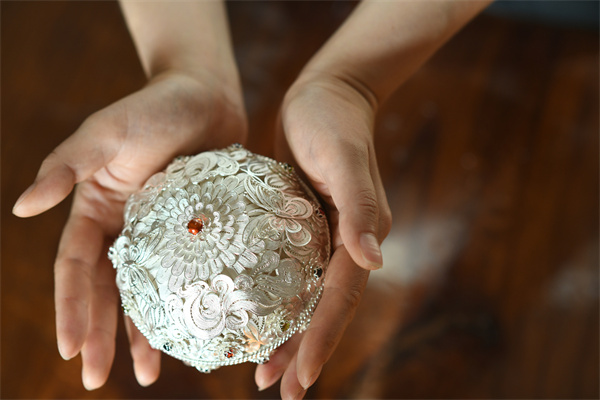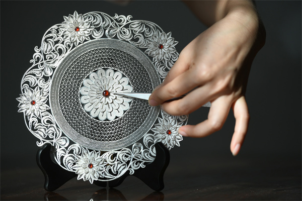 吴秋燕的心很累了,却找不到更好的做法,于是,不得不放缓了几天,心态调整好后又重操旧业。她丈夫主动携手切磋技艺,研究,反复尝试。一个月后,花丝盘终于精致出炉,熠熠生辉。