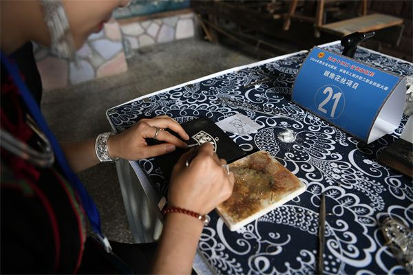 7月5日,贵州省凯里市,苗族选手吴秋燕在参加银饰制作比赛作品。(杨仁海 摄)