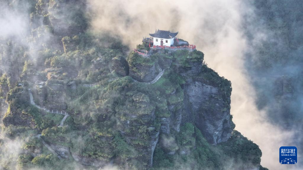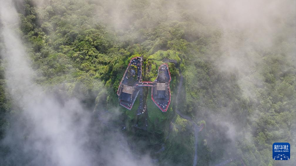 7月15日在贵州梵净山红云金顶拍摄的云雾景观(无人机照片)。新华社发(李鹤 摄)