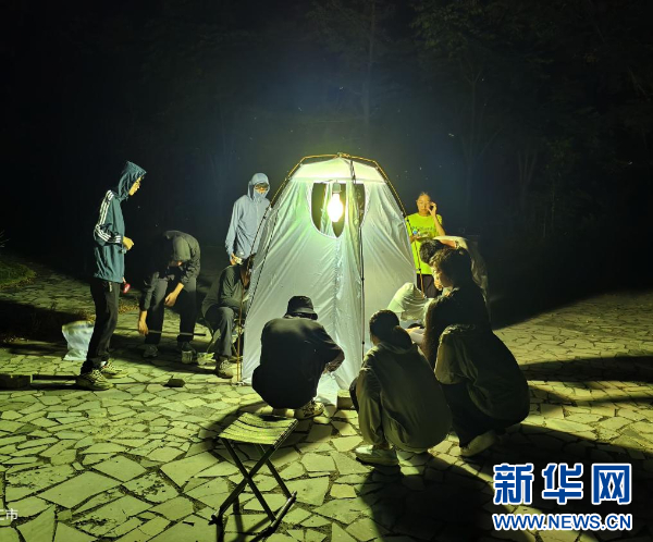 夜晚,同学们在徐海君、吴琼、唐璞、姚洪渭等四位老师的指导下,在管理站旁立起了诱虫装置,巨大的白炽灯泡亮起,四面八方飞来的昆虫聚在白炽灯下拉开了盛大的捉虫战斗,同学们有的用手抓、有的用瓶装,好不热闹,通过灯诱捕获了许多昆虫。