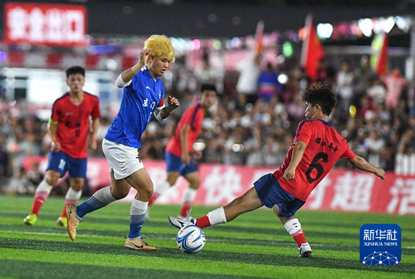 7月20日,党相村足球队球员陆金福(右)与东门村足球队球员陈俊朋(左二)拼抢。新华社记者 杨文斌 摄