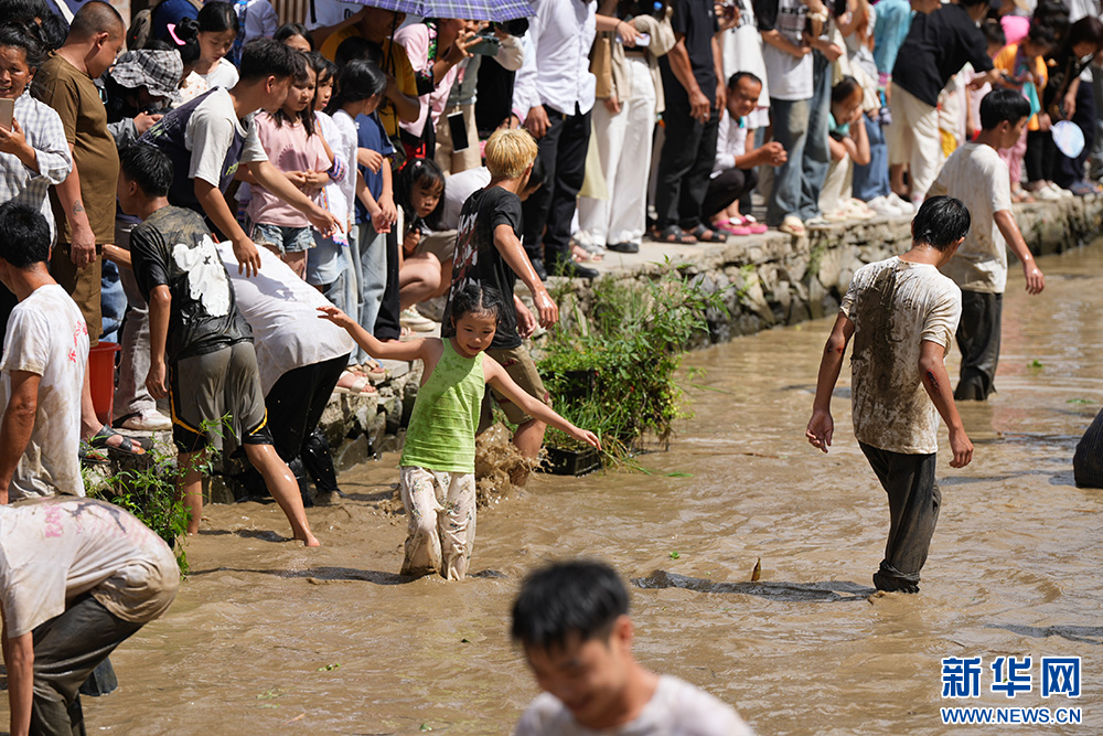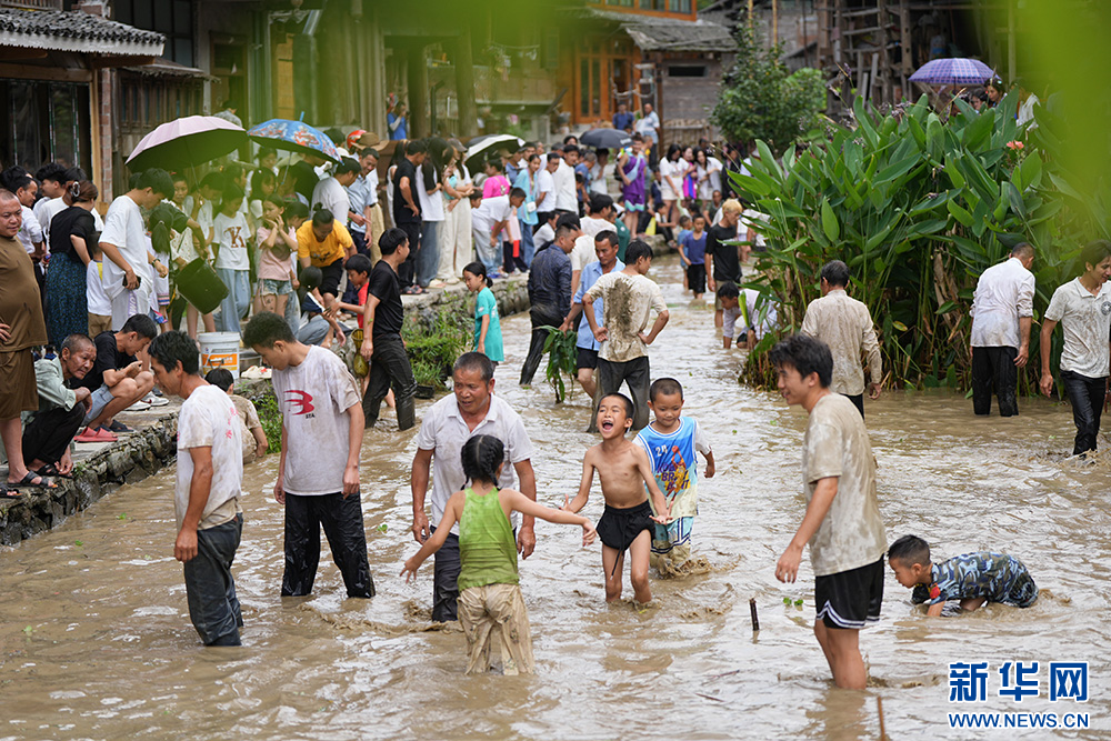 7月20日,在贵州省黎平县双江镇黄岗侗寨,人们在稻田里参加“捉鱼”活动。新华网发(龙建睿 摄)pagebreak