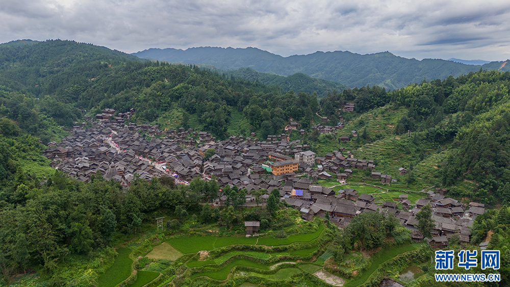 这是7月20日拍摄的贵州省黎平县双江镇黄岗侗寨全景(无人机照片)。新华网发(龙建睿 摄)