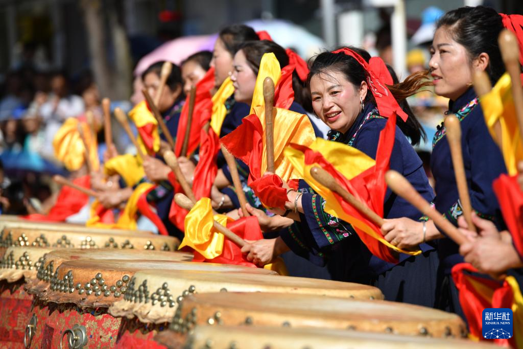 7月21日,非遗项目思州战鼓表演者在贵州省丹寨县参加非遗展演。新华社发(梁文 摄)pagebreak