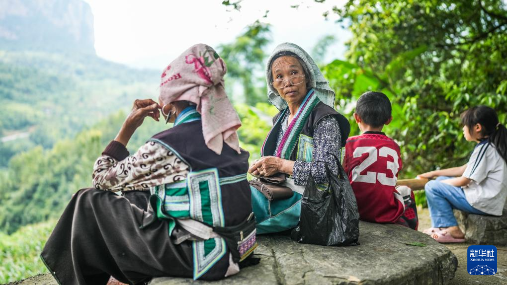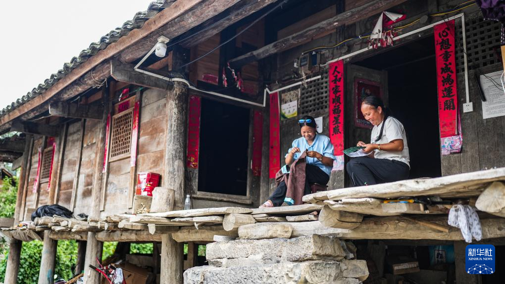天门村村民陆大珍(左)、王兴珍在吊脚楼上制作绣片(7月16日摄)。新华社记者 陶亮 摄pagebreak