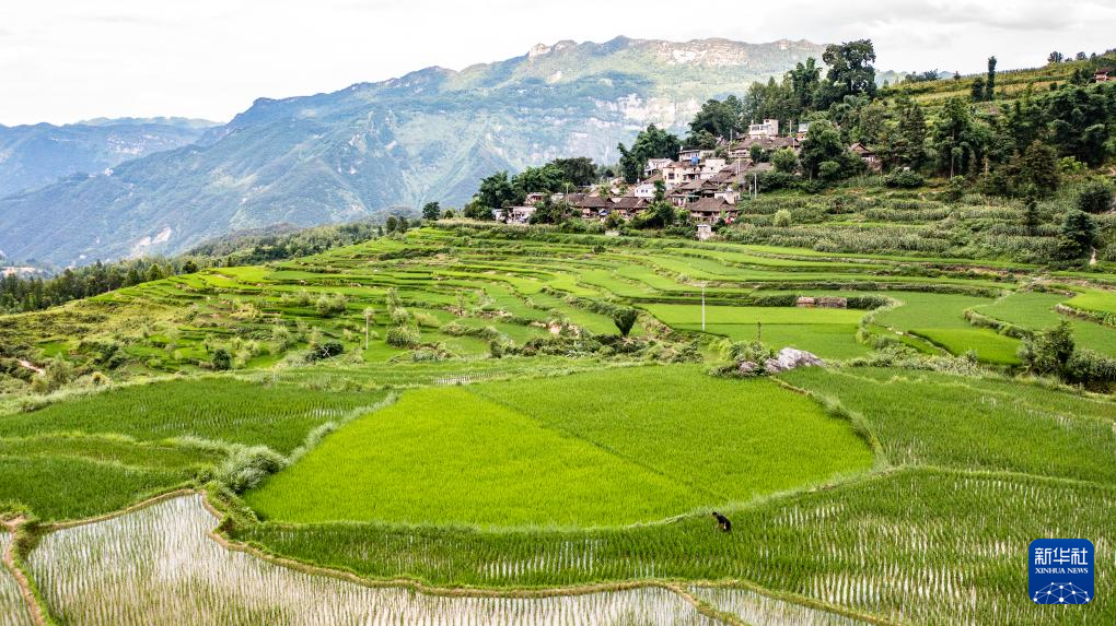 天门村的远山、树林、梯田、民居构成了美丽的田园画卷(7月16日摄,无人机照片)。新华社记者 陶亮 摄pagebreak