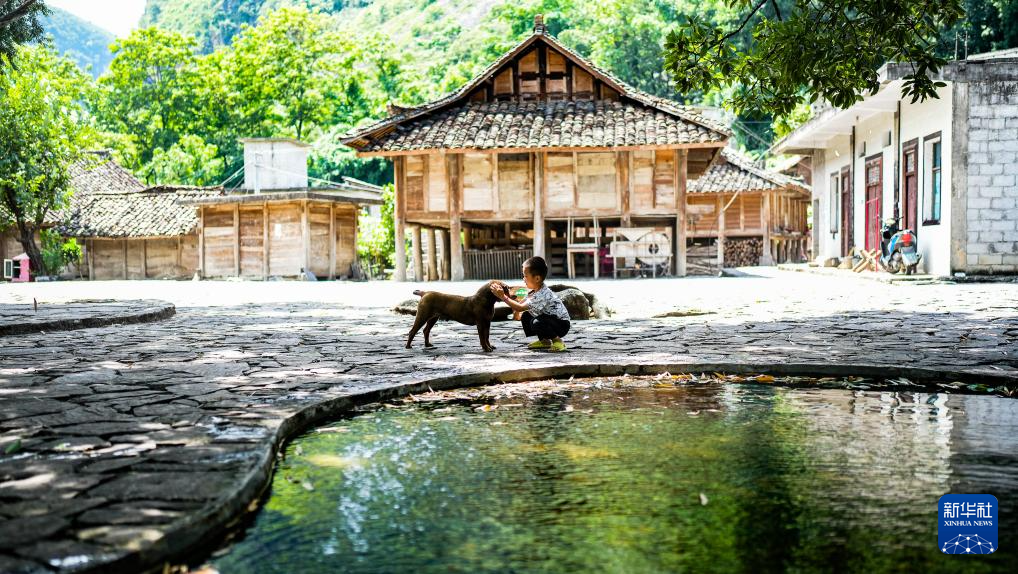 小朋友在天门村和小狗玩耍(7月16日摄)。新华社记者 陶亮 摄pagebreak
