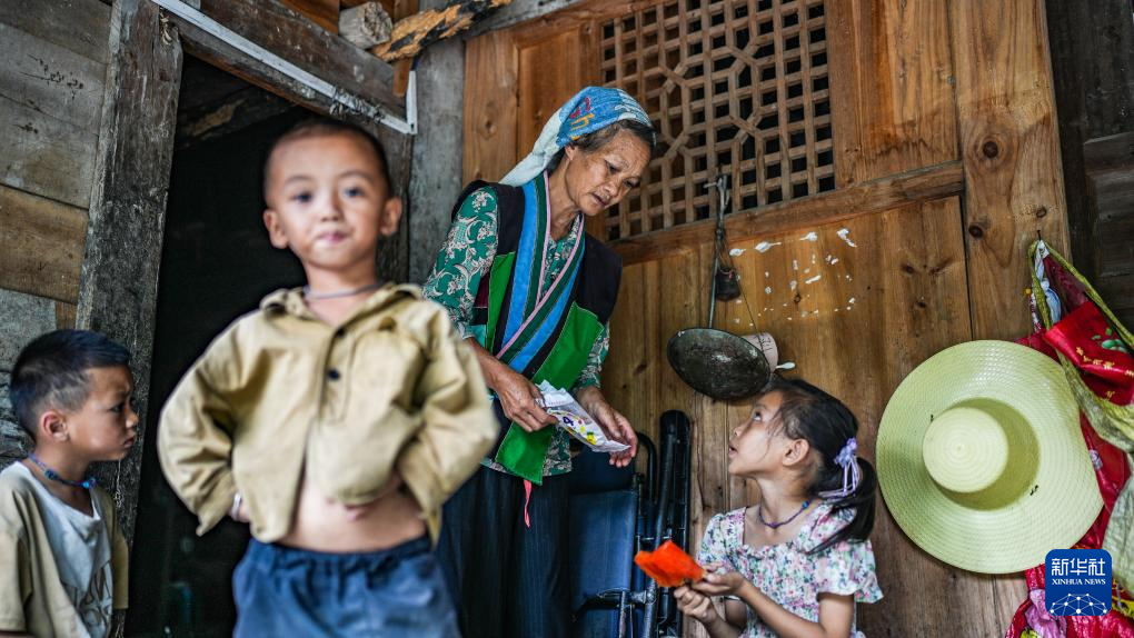 天门村村民陆凤给孙女和孙子发冰棒(7月16日摄)。新华社记者 陶亮 摄pagebreak