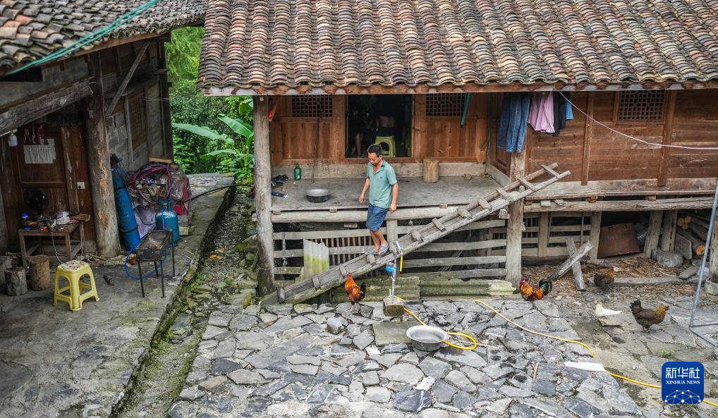 天门村村民王仕洪从吊脚楼走下(7月17日摄)。新华社记者 陶亮 摄pagebreak