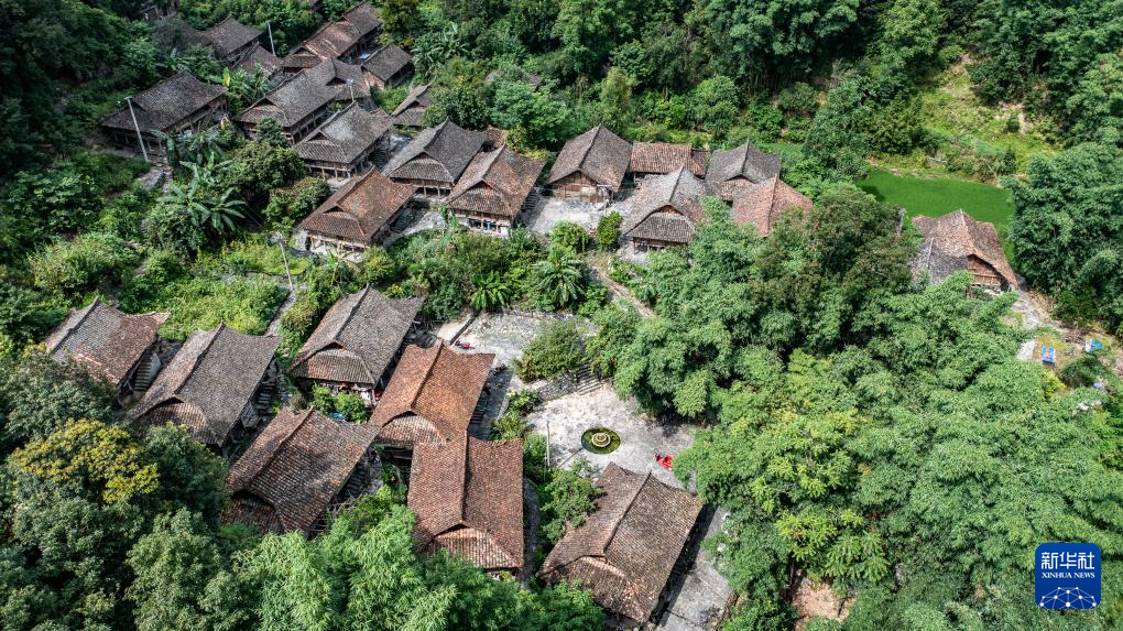 天门村小寨组的吊脚楼群一隅(7月17日摄,无人机照片)。新华社记者 陶亮 摄