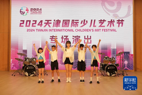7月23日,香港梦想世纪少儿艺术团在天津演出后合影。新华社发