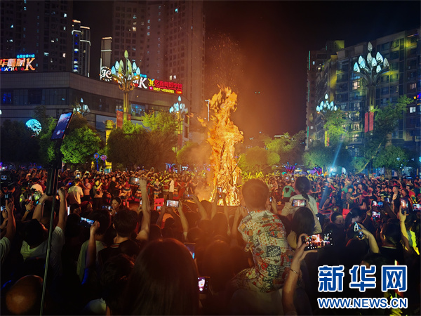 游客与当地群众围绕在炽热的篝火旁拍照留念。新华网发(蒋林浩 摄)