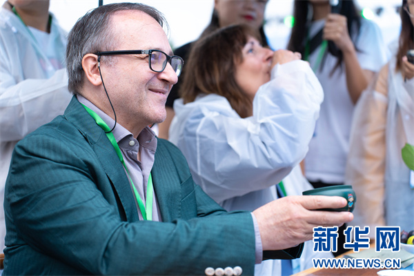 国际嘉宾鉴赏都匀毛尖茶。新华网发(刘德文 摄)