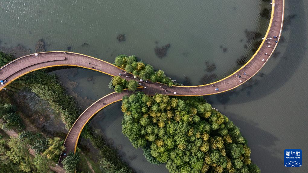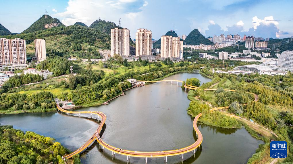 位于贵州省六盘水市钟山区的明湖国家湿地公园植被丰富,风景如画,吸引人们前来休闲游玩。
